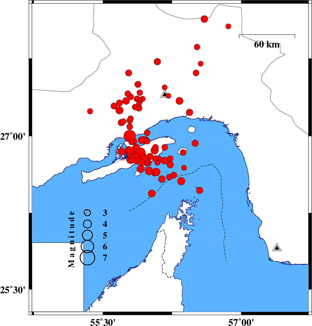 2005/11/27 | 10:22:19.2 | 13:52:19.2 | 26.83 | 55.82 | 8 | Mb:6 | Persian Gulf, 46 km South-West of Qeshm | ||