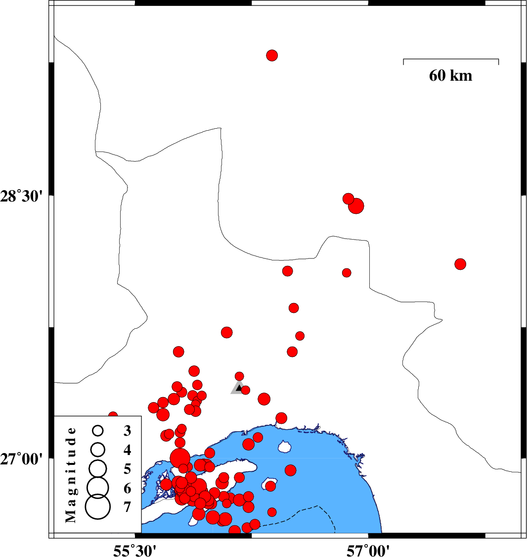 2005/11/27 | 16:30:39.1 | 20:00:39.1 | 27 | 55.79 | 14 | Mb:5.8 | Persian Gulf, 47 km West of Qeshm | ||
