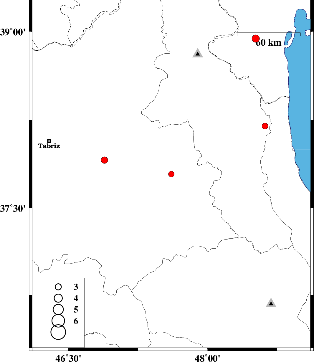 | 2004/12/13 | 02:02:32.5 | 05:32:32.5 | 38.94 | 48.52 | 33 | ML:3.6 | 38 km East of Germi, Ardebil Province |