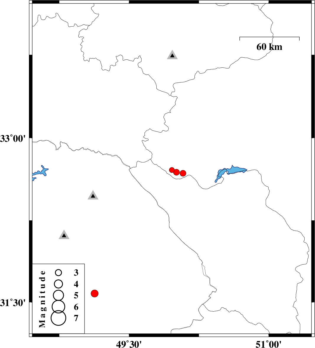 | 2004/12/29 | 04:50:50.6 | 08:20:50.6 | 31.58 | 49.13 | 30 | ML:3.5 | 42 km South-West of Masjed Soleyman, Khoozestan Province | ||