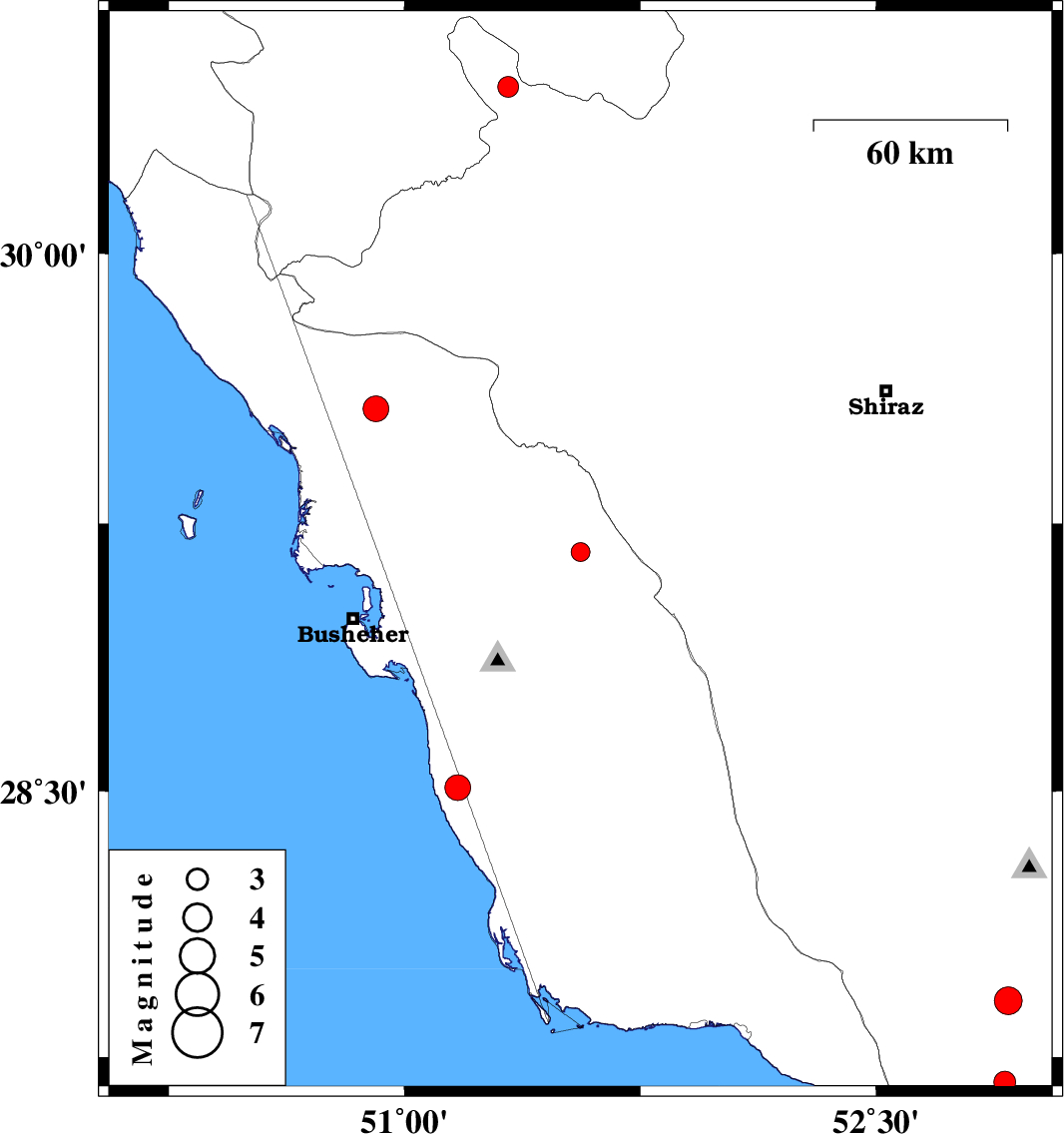 2004/12/22 | 15:55:10.6 | 19:25:10.6 | 29.57 | 50.91 | 14 | ML:3.7 | 38 km East of Bandar-e genaveh, Bushehr Province |