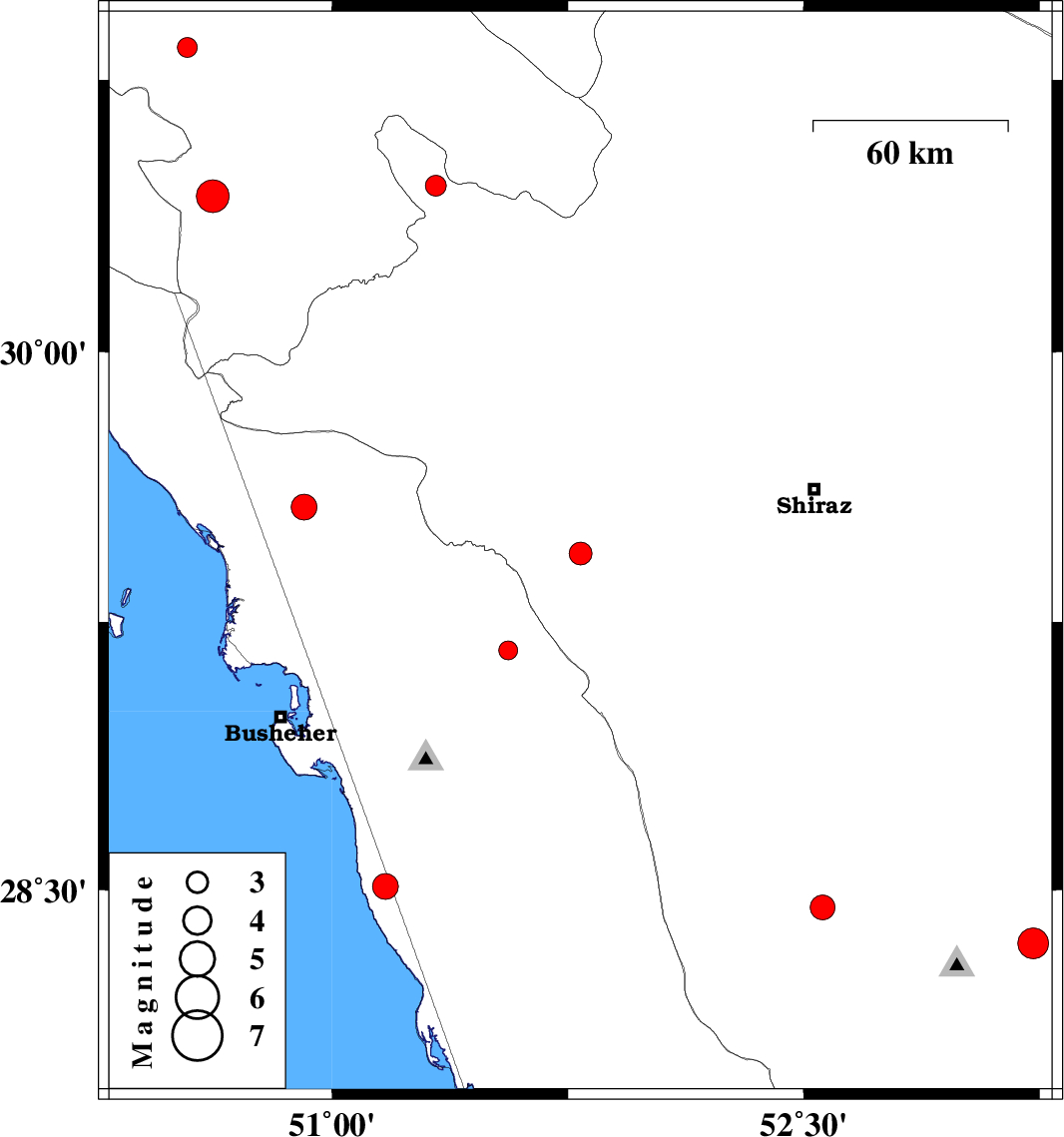 2004/12/22 | 15:55:10.6 | 19:25:10.6 | 29.57 | 50.91 | 14 | ML:3.7 | 38 km East of Bandar-e genaveh, Bushehr Province | ||