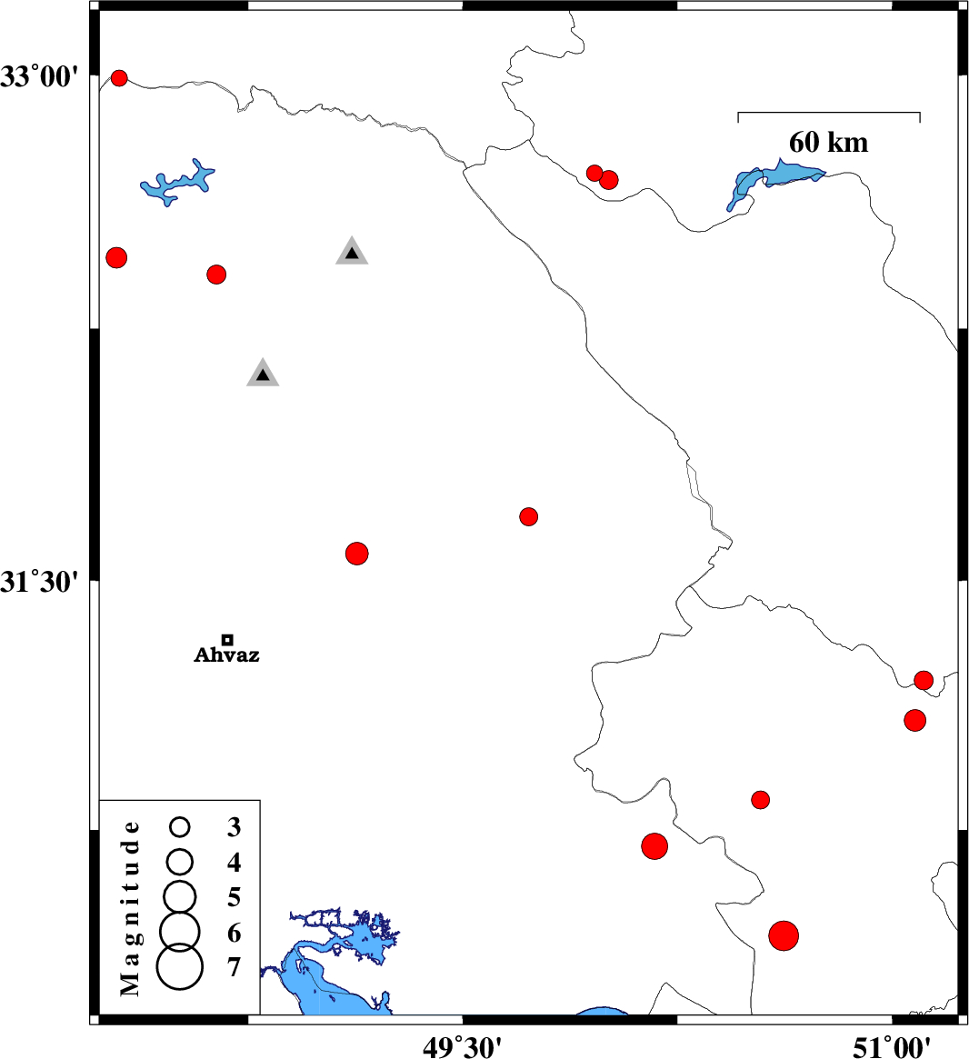 2004/12/29 | 04:50:50.6 | 08:20:50.6 | 31.58 | 49.13 | 30 | ML:3.5 | 42 km South-West of Masjed Soleyman, Khoozestan Province | ||