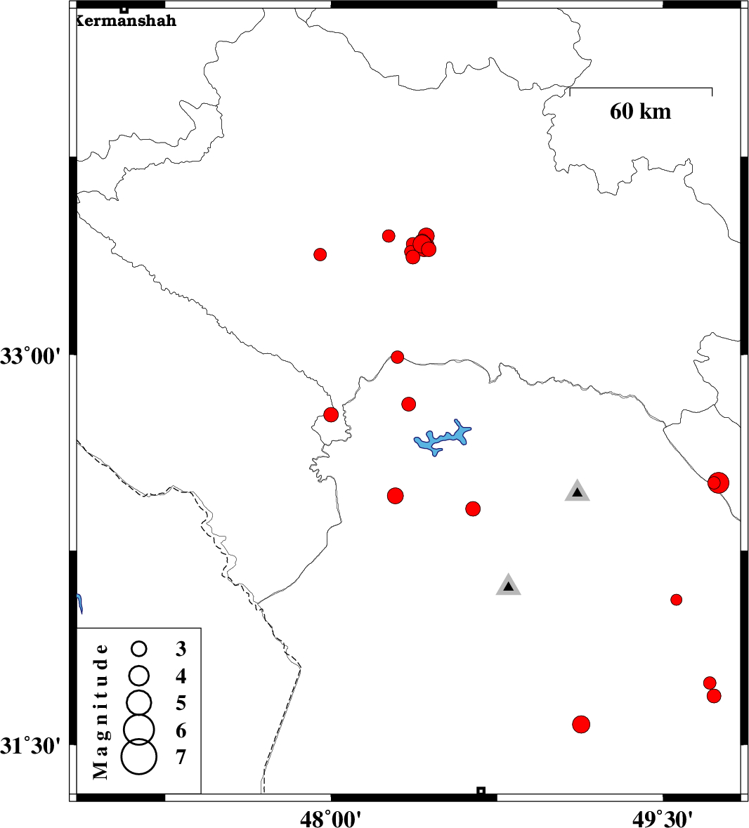 2004/12/30 | 23:19:20.6 | 02:49:20.6 | 33.38 | 47.95 | 15 | ML:2.5 | 33 km North-East of Pol-e dokhtar, Lorestan Province | ||