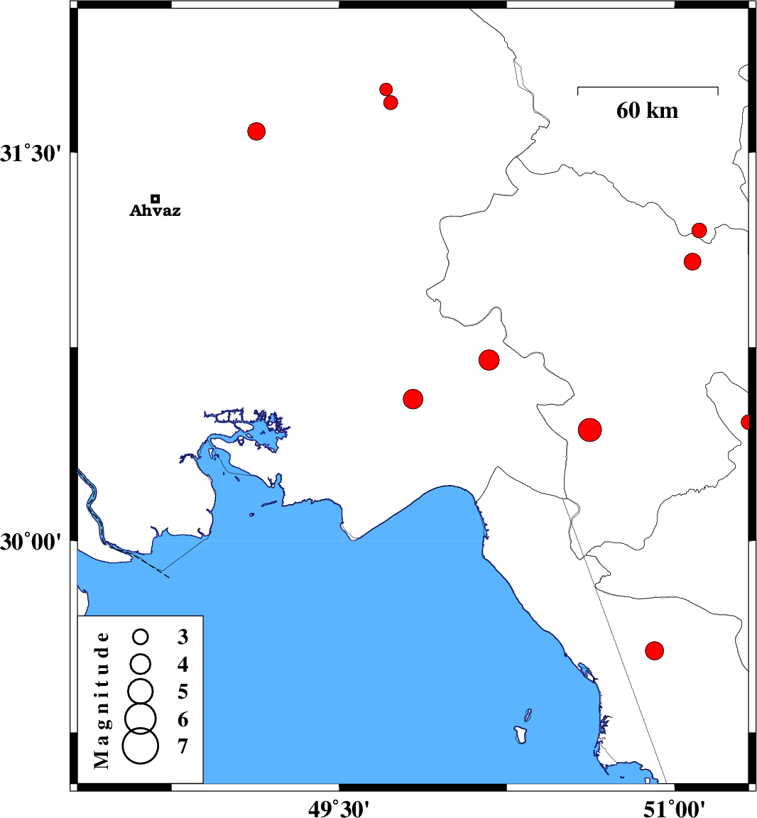 | 2004/12/29 | 04:50:50.6 | 08:20:50.6 | 31.58 | 49.13 | 30 | ML:3.5 | 42 km South-West of Masjed Soleyman, Khoozestan Province | ||