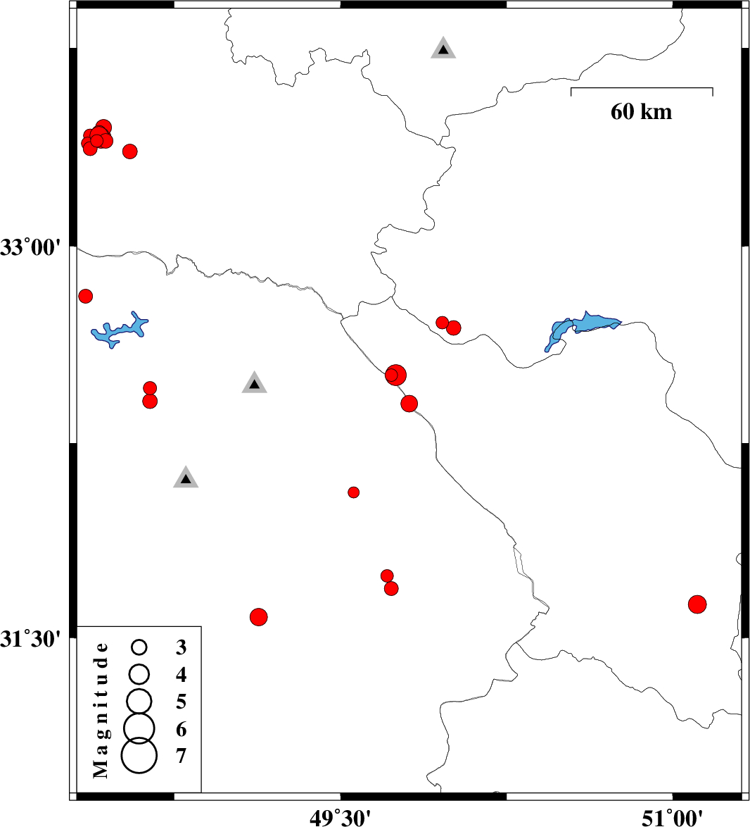 | 2004/12/29 | 04:50:50.6 | 08:20:50.6 | 31.58 | 49.13 | 30 | ML:3.5 | 42 km South-West of Masjed Soleyman, Khoozestan Province |