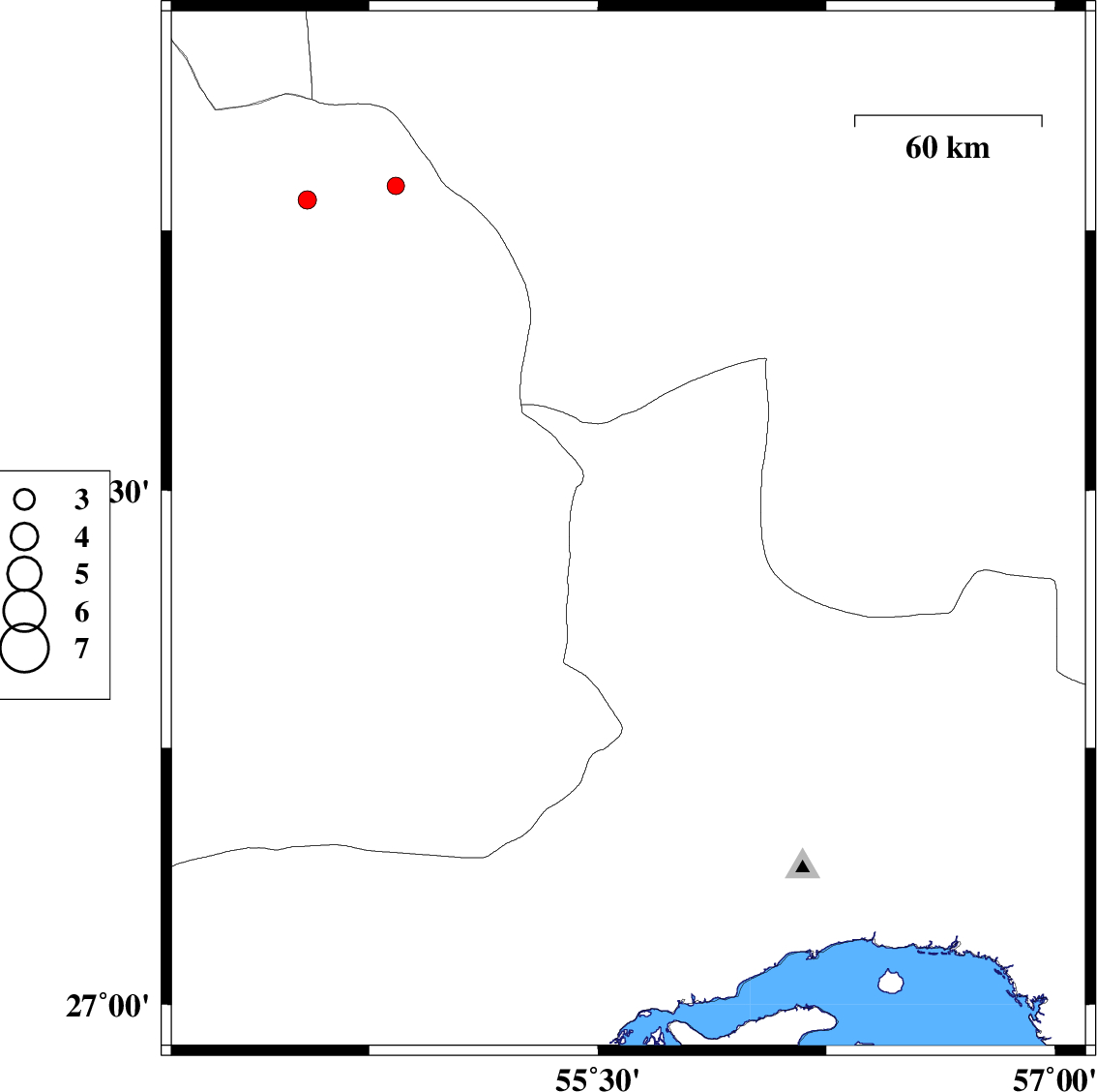 | 2005/01/27 | 08:26:15.8 | 11:56:15.8 | 28.34 | 55.31 | 15 | ML:2.7 |