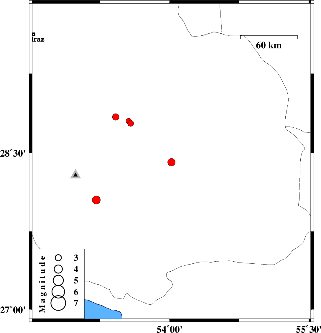 | 2004/08/28 | 09:15:53.1 | 13:45:53.1 | 28.8 | 53.56 | 6 | ML:2.7 | 18 km South of Fasa, Fars Province |