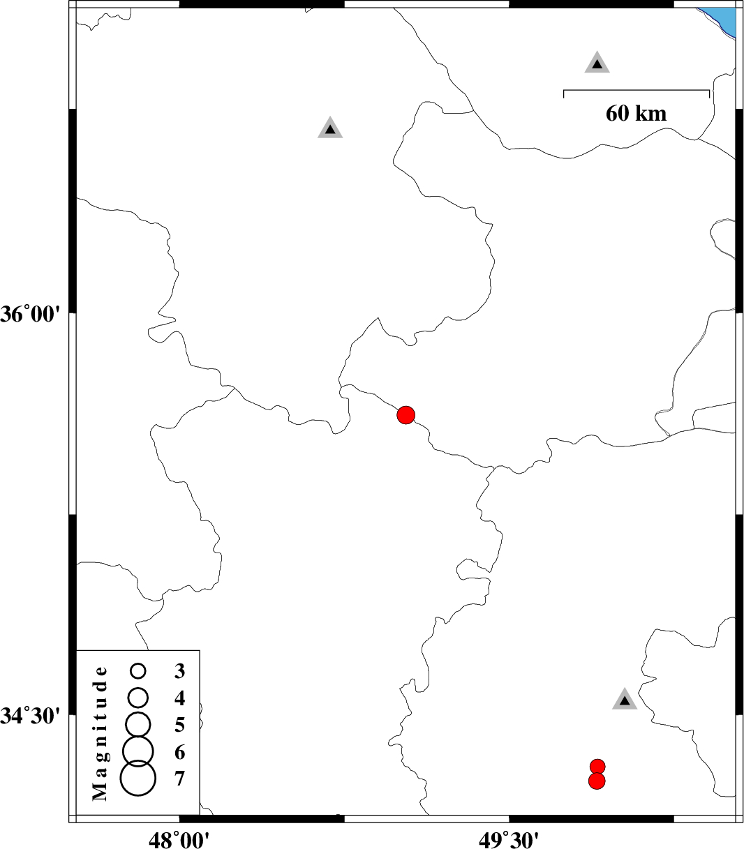 | 2004/07/02 | 12:56:39.9 | 17:26:39.9 | 35.62 | 49.03 | 14 | ML:3.7 | 25 km North of Razan, Hamedan Province | ||