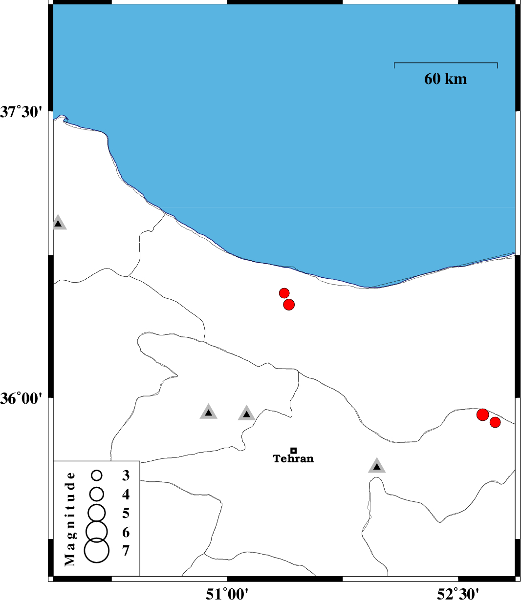 | 2004/07/03 | 06:43:28.1 | 11:13:28.1 | 36.55 | 51.37 | 22 | ML:3 | 12 km South of Chalus, Mazandaran Province | ||