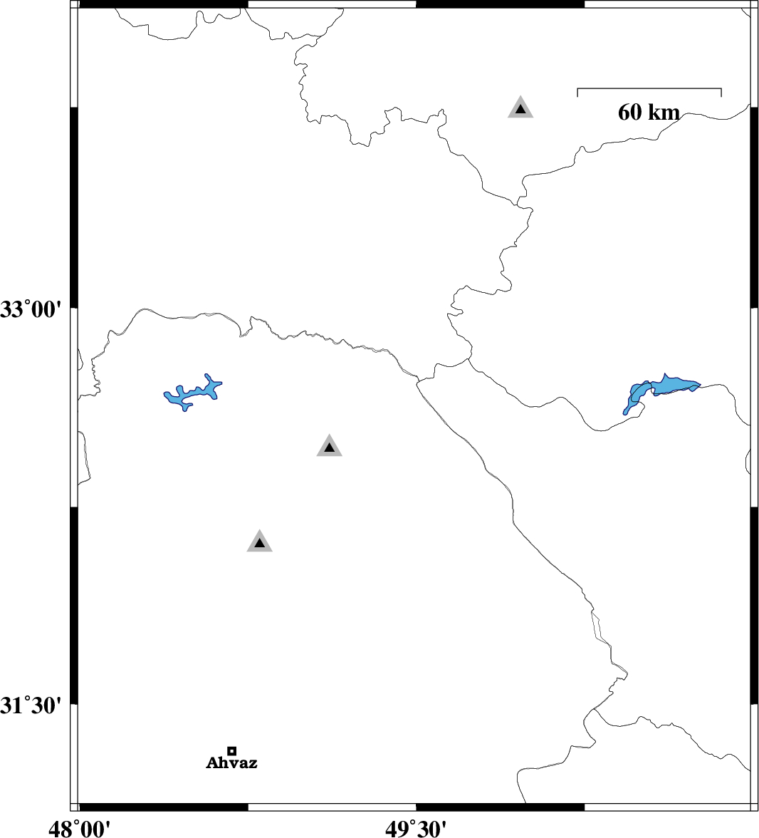 | 2004/07/10 | 07:57:55.2 | 12:27:55.2 | 31.49 | 50.1 | 14 | ML:3.6 | 19 km East of Bagh Malek, Khoozestan Province |