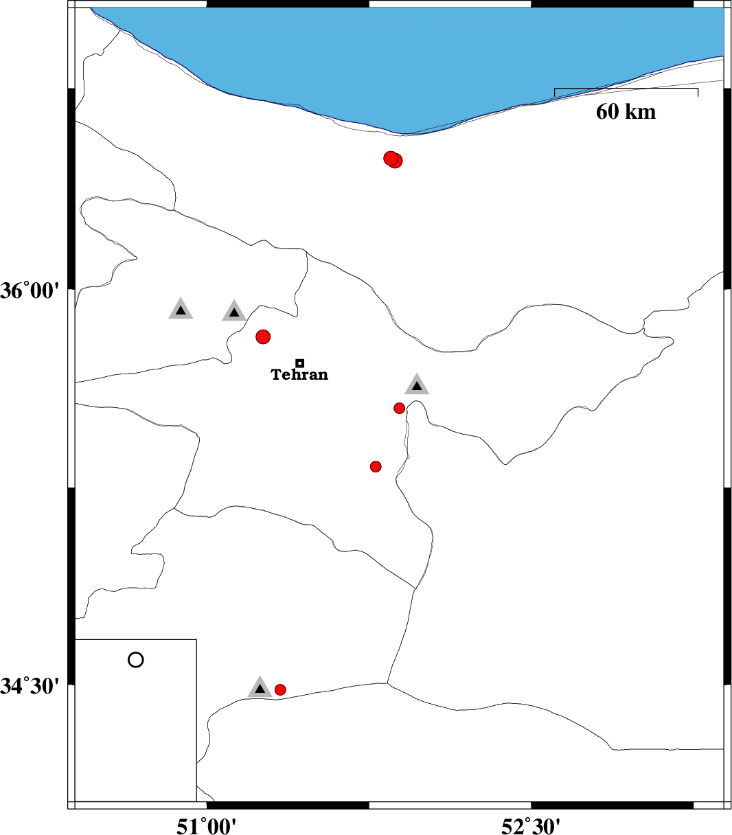 | 2004/09/09 | 01:36:49.4 | 06:06:49.4 | 35.82 | 51.26 | 6 | ML:2.9 | 16 km West of Tajrish, Tehran Province | ||