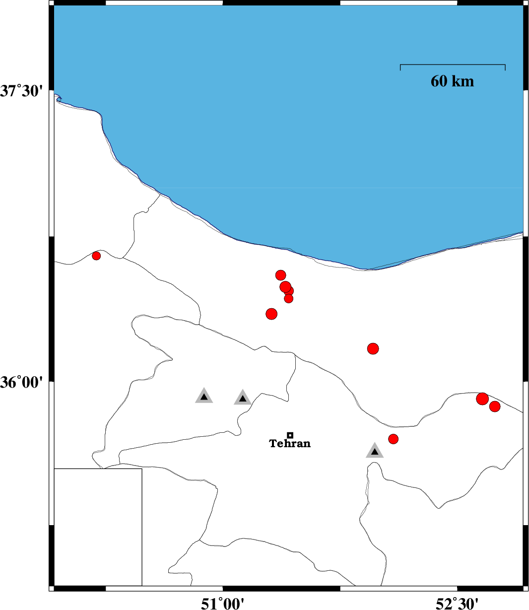 | 2004/07/11 | 13:16:46.7 | 17:46:46.7 | 36.35 | 51.31 | 14 | ML:3.3 | 35 km South-West of Chalus, Mazandaran Province | ||