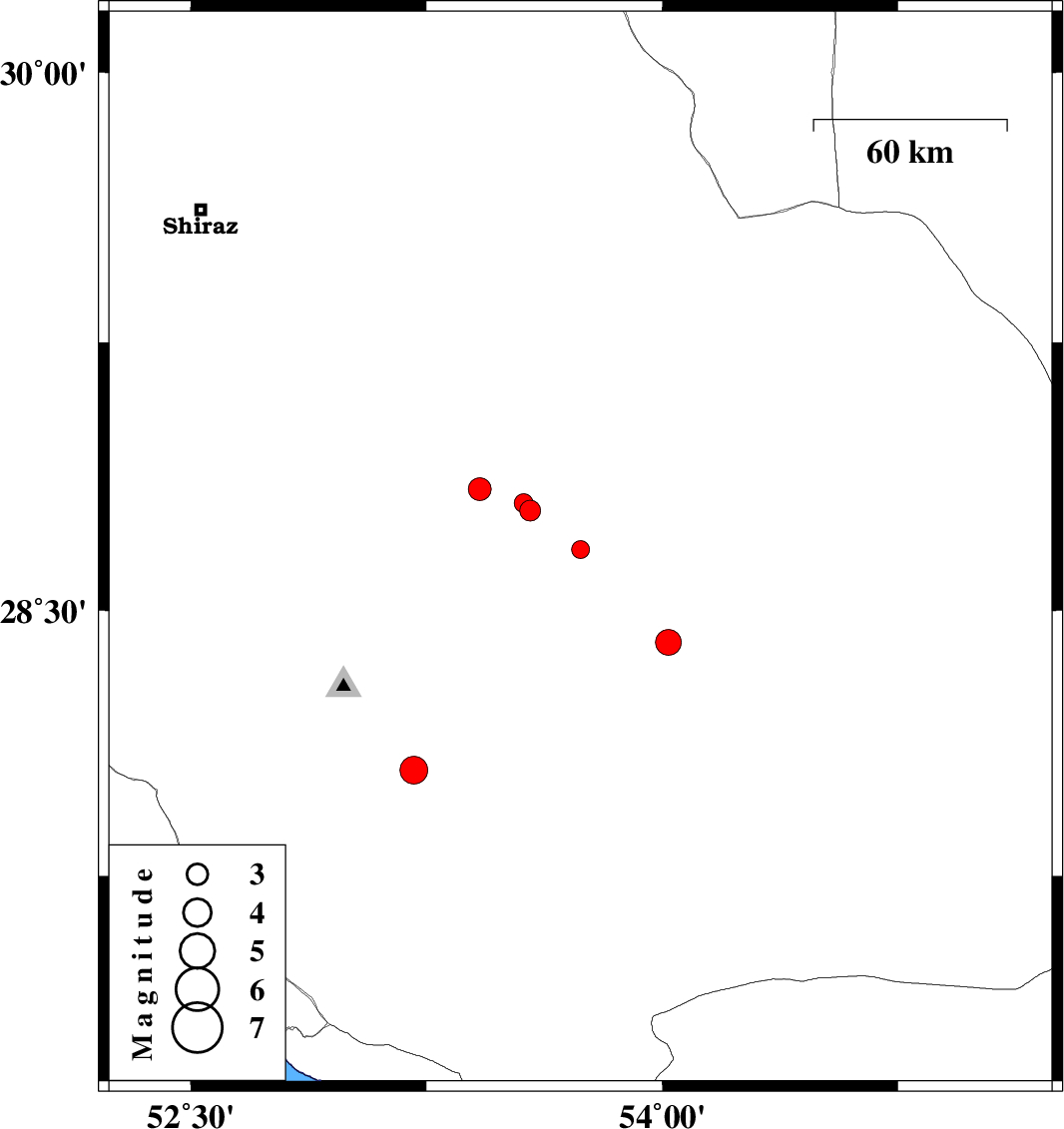 | 2004/08/31 | 04:54:42.3 | 09:24:42.3 | 28.78 | 53.58 | 6 | ML:3 | 20 km South of Fasa, Fars Province | ||