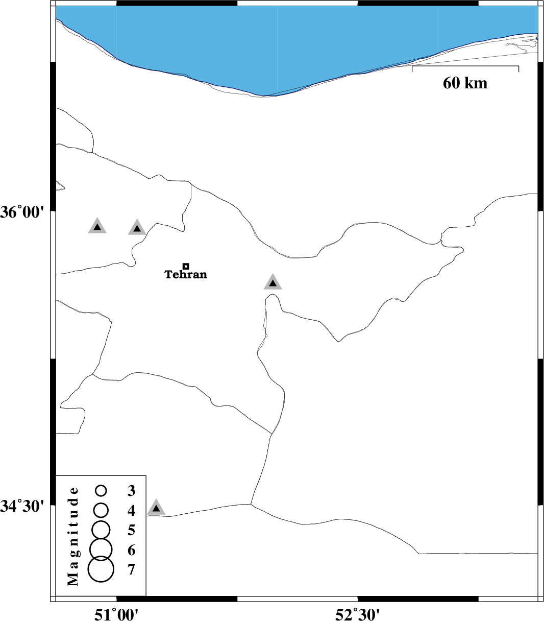 | 2004/09/24 | 01:42:50.9 | 05:12:50.9 | 35.53 | 52.12 | 16 | ML:3.8 | 20 km South of Damavand, Tehran Province |