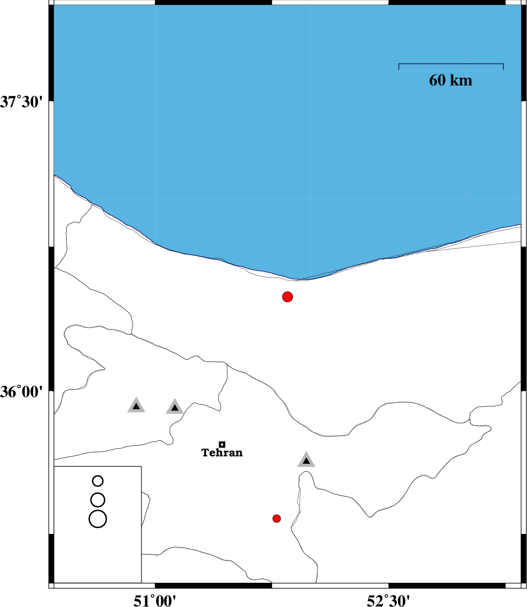 | 2004/08/30 | 12:16:04.0 | 16:46:04.0 | 36.49 | 51.85 | 6 | ML:2.9 | 18 km West of Nur, Mazandaran Province | ||