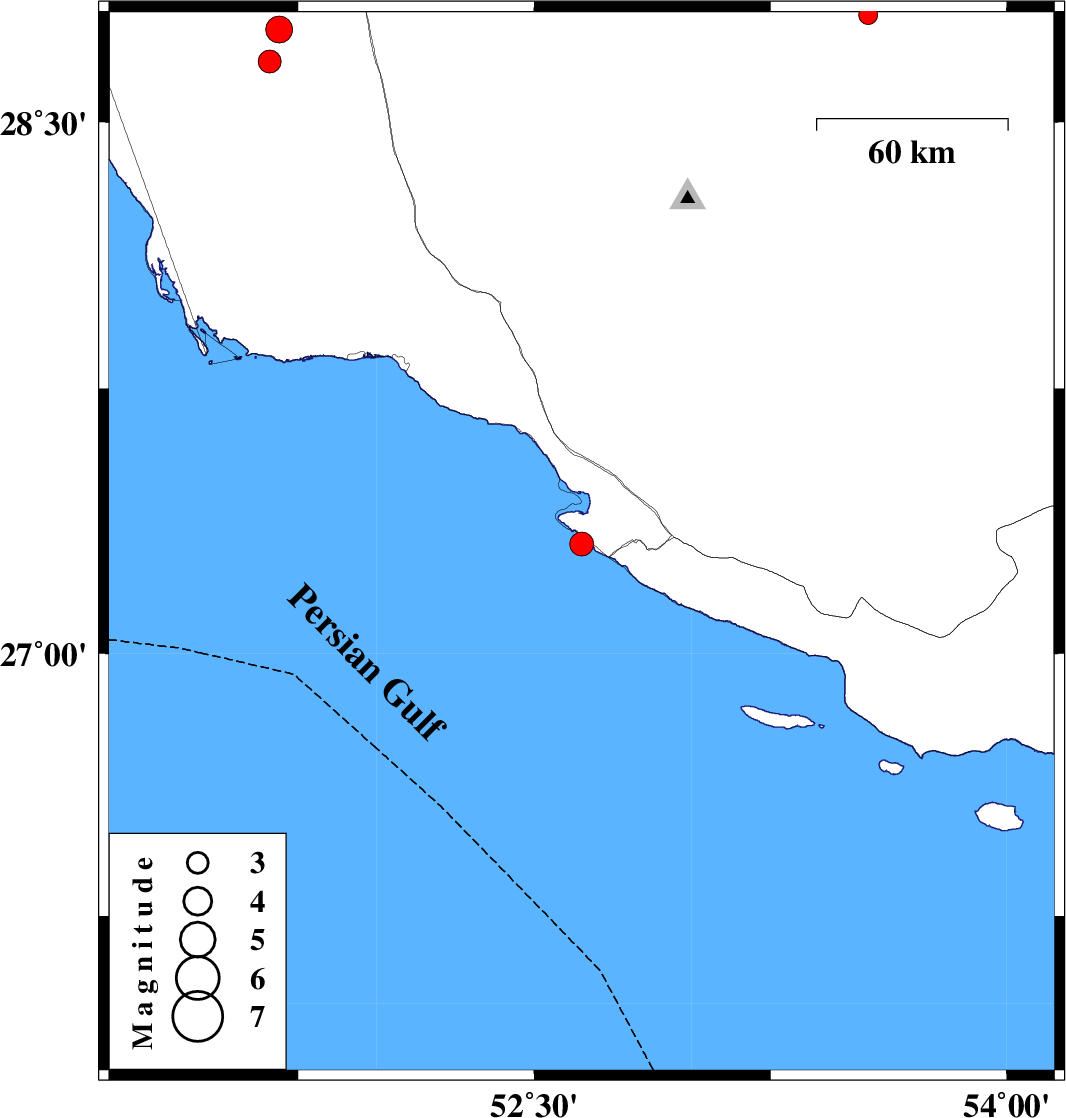 | 2004/08/27 | 17:46:44.2 | 22:16:44.2 | 28.76 | 51.69 | 6 | ML:3.8 | 32 km North-East of Khormog, Bushehr Province |