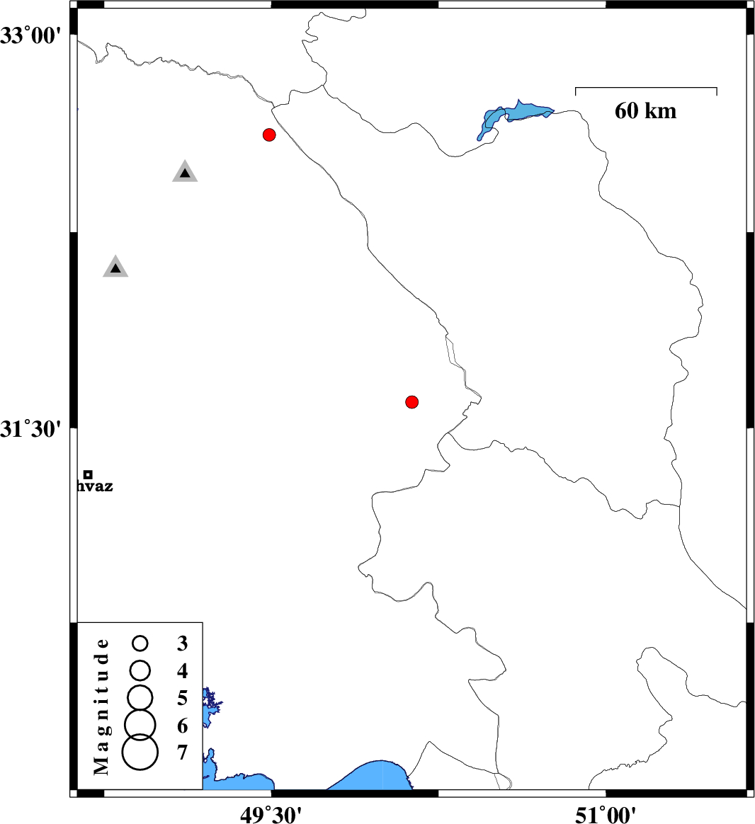 | 2004/08/04 | 21:34:59.8 | 02:04:59.8 | 32.62 | 49.49 | 14 | ML:2.6 | 43 km North-East of Lali, Khoozestan Province |