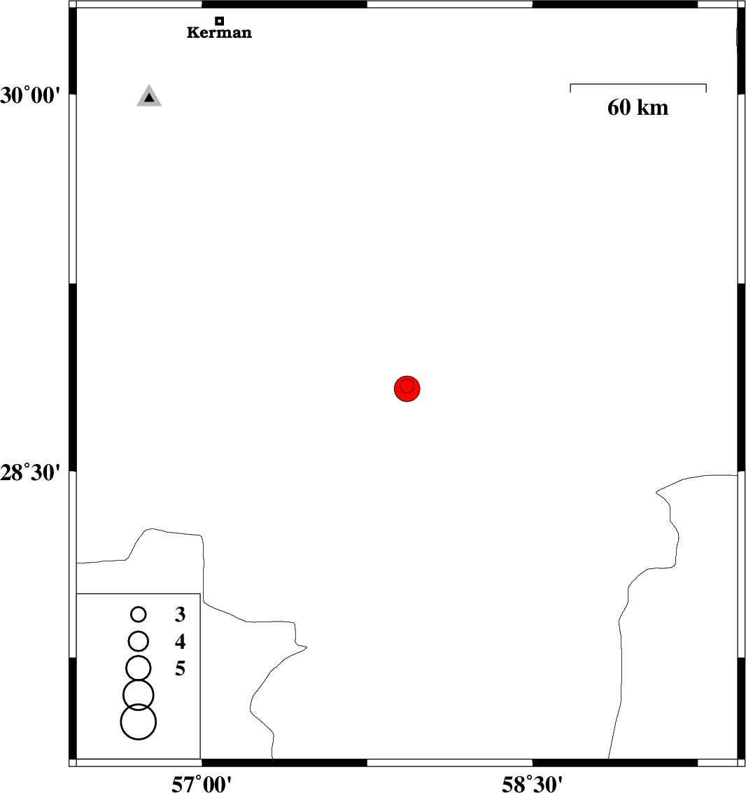 | 2004/10/06 | 11:14:26.1 | 14:44:26.1 | 28.83 | 57.93 | 14 | ML:5.2 | 25 km North-East of Jiroft, Kerman Province |