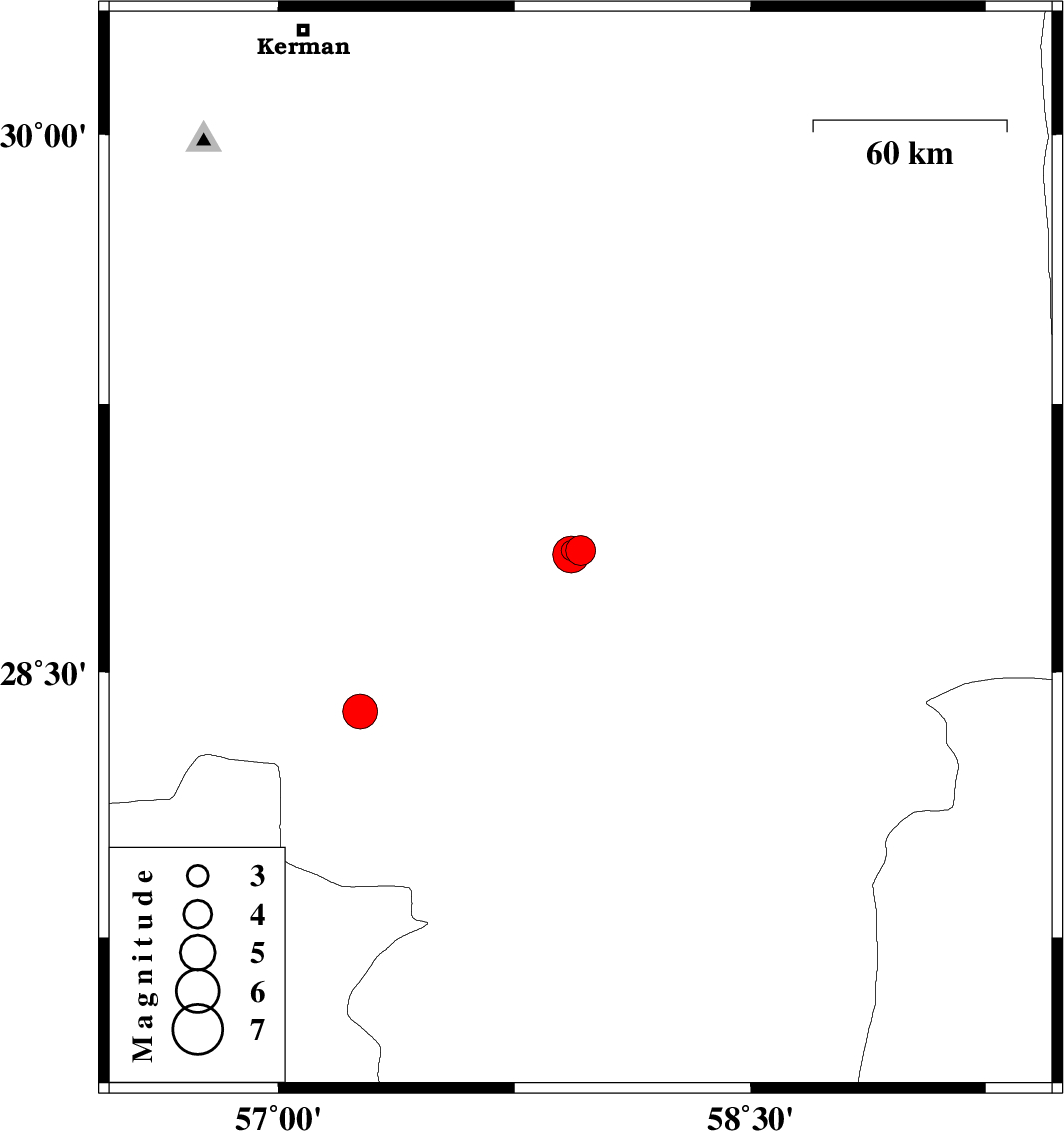 | 2004/10/06 | 11:14:26.1 | 14:44:26.1 | 28.83 | 57.93 | 14 | ML:5.2 | 25 km North-East of Jiroft, Kerman Province |