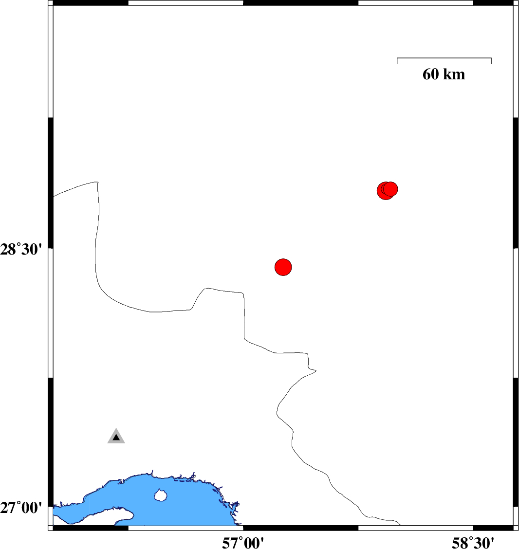 | 2004/10/06 | 19:22:26.1 | 22:52:26.1 | 28.84 | 57.93 | 14 | ML:2.8 | 26 km North-East of Jiroft, Kerman Province | ||