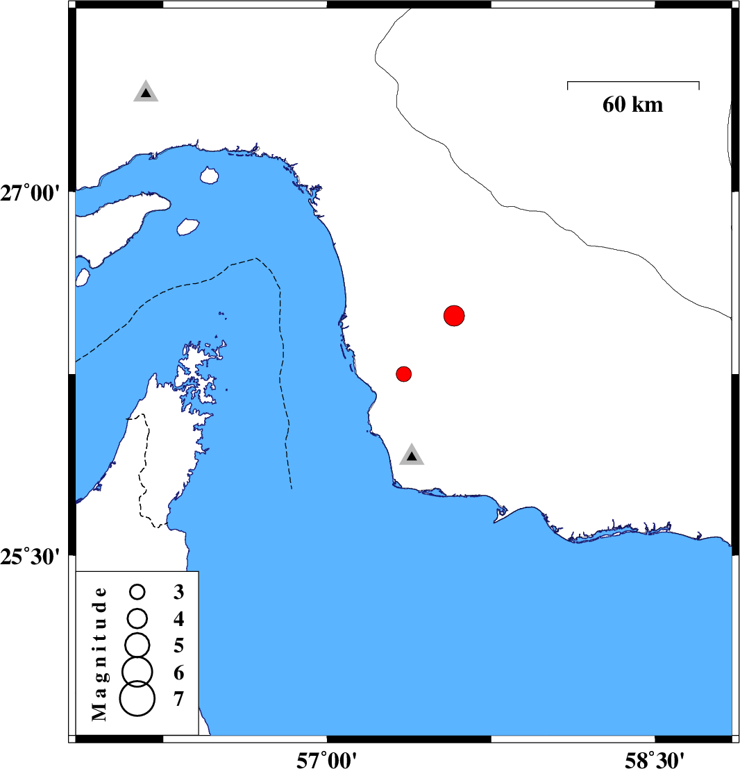 | 2004/10/11 | 06:57:02.0 | 10:27:02.0 | 26.25 | 57.35 | 41 | ML:3.1 | 80 km North-West of Jask, Hormozgan Province | ||