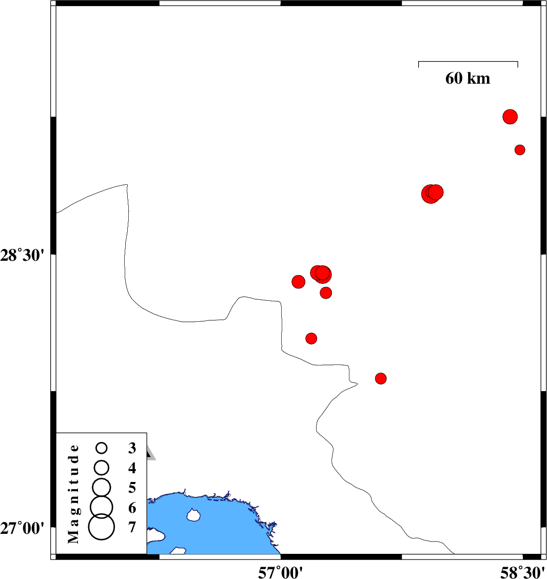 2004/10/09 06:08:20.8 09:38:20.8 28.457.2314 ML:4.1 57 km South-West of Jiroft, Kerman Province