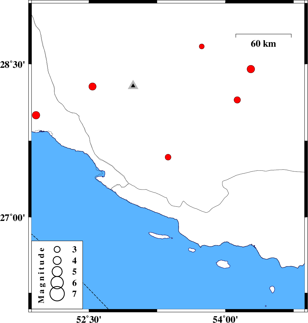 | 2004/09/28 | 16:53:15.4 | 20:23:15.4 | 28 | 51.92 | 6 | ML:3.8 | 23 km North-West of Bandar-e kangan, Bushehr Province | ||