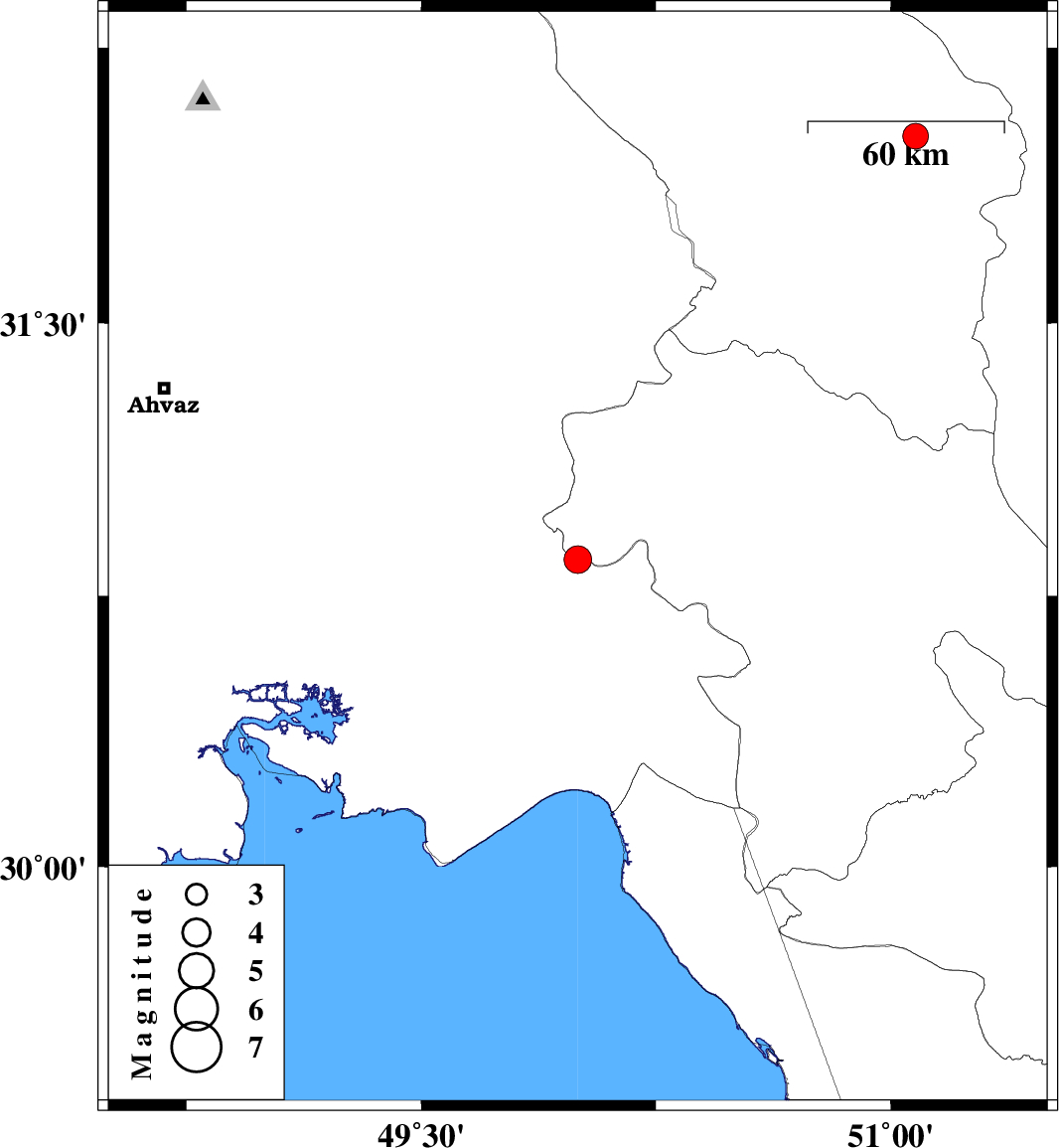 | 2004/10/14 | 10:48:07.2 | 14:18:07.2 | 30.85 | 50 | 36 | ML:3.9 | 29 km East of Omidiyeh, Khoozestan Province | ||