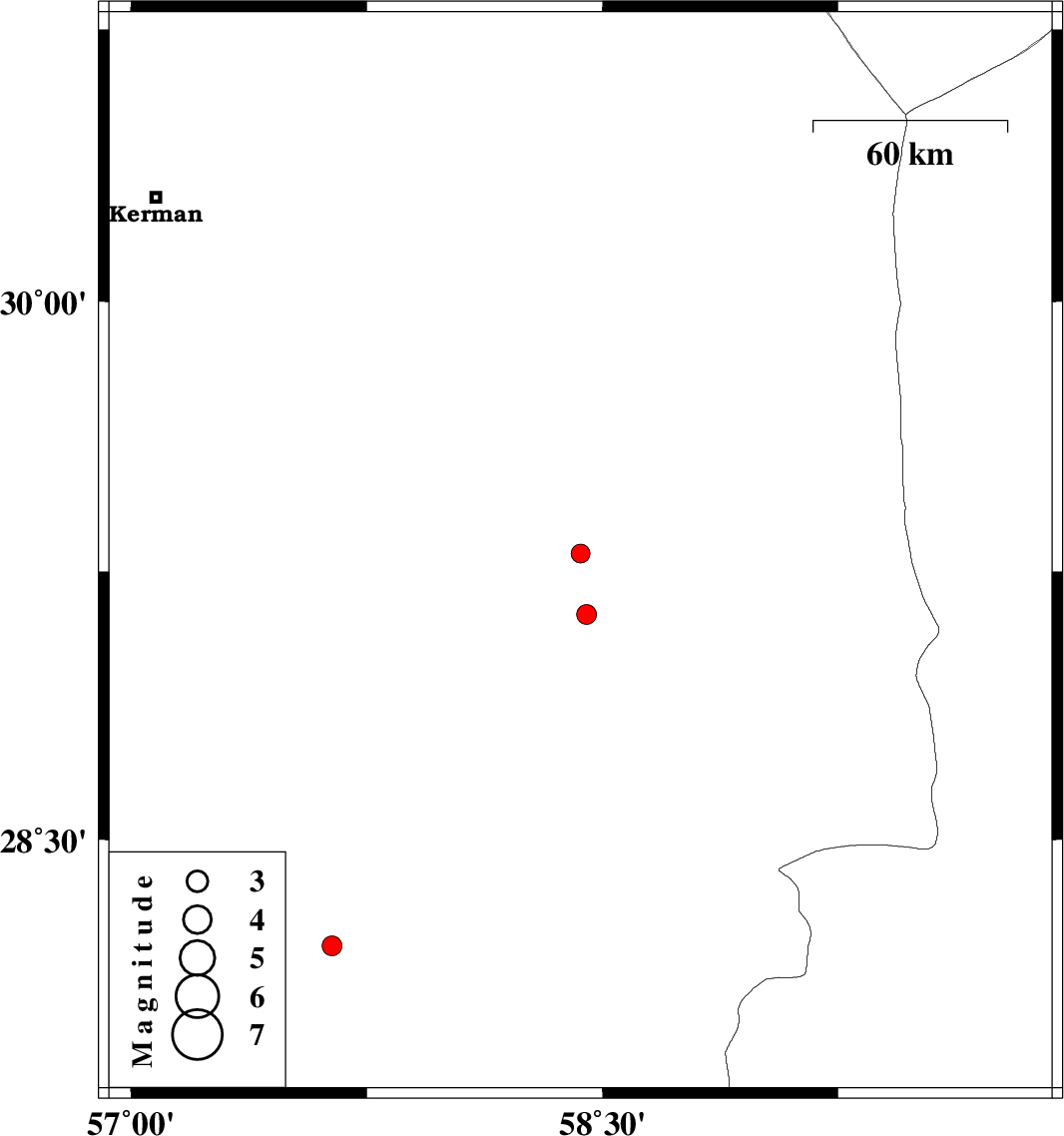 2004/10/18 06:42:18.4 10:12:18.4 28.257.6414 ML:2.8 27 km North of Kahnuj, Kerman Province