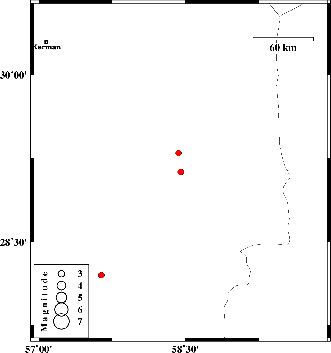 | 2004/10/18 | 06:42:18.4 | 10:12:18.4 | 28.2 | 57.64 | 14 | ML:2.8 | 27 km North of Kahnuj, Kerman Province |