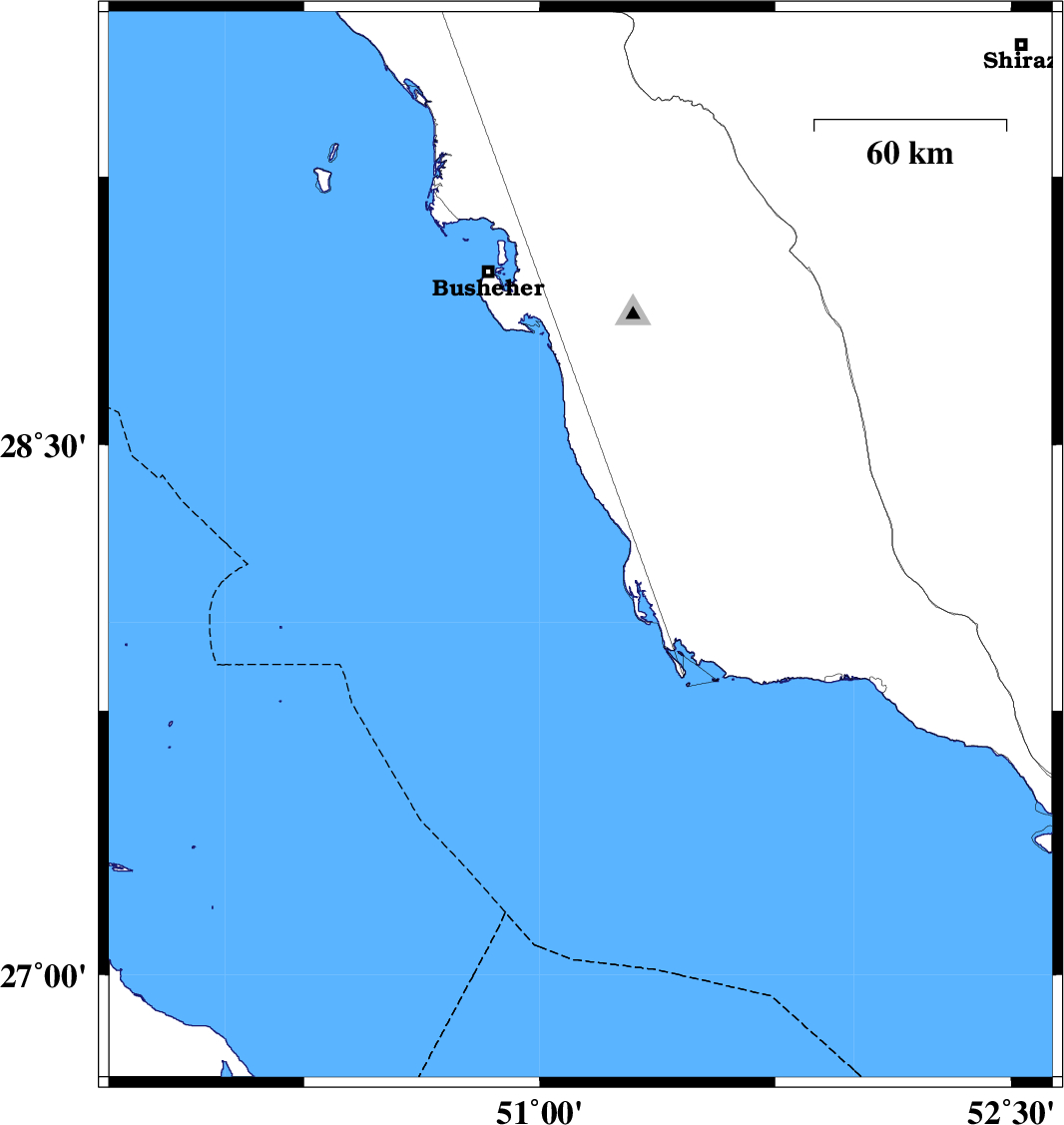| 2004/11/06 | 23:19:40.6 | 02:49:40.6 | 28.21 | 51.13 | 40 | ML:4.5 | Persian Gulf, 54 km South-West of Khormog | ||
