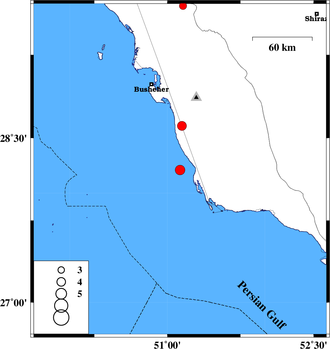 | 2004/11/06 | 23:19:40.6 | 02:49:40.6 | 28.21 | 51.13 | 40 | ML:4.5 | Persian Gulf, 54 km South-West of Khormog | ||