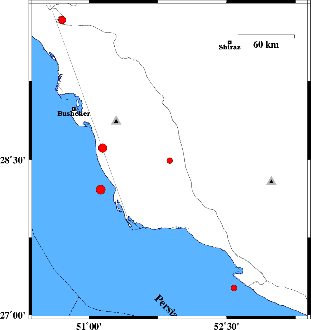 | 2004/11/05 | 16:58:09.0 | 20:28:09.0 | 29.83 | 50.71 | 14 | ML:3.7 | 34 km North-East of Bandar-e genaveh, Bushehr Province |