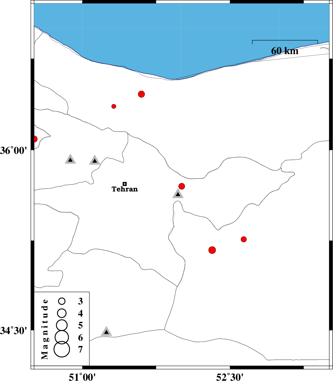 | 2004/11/13 | 15:05:50.5 | 18:35:50.5 | 35.7 | 52.01 | 18 | ML:2.8 | 6 km Damavand, Tehran Province | ||