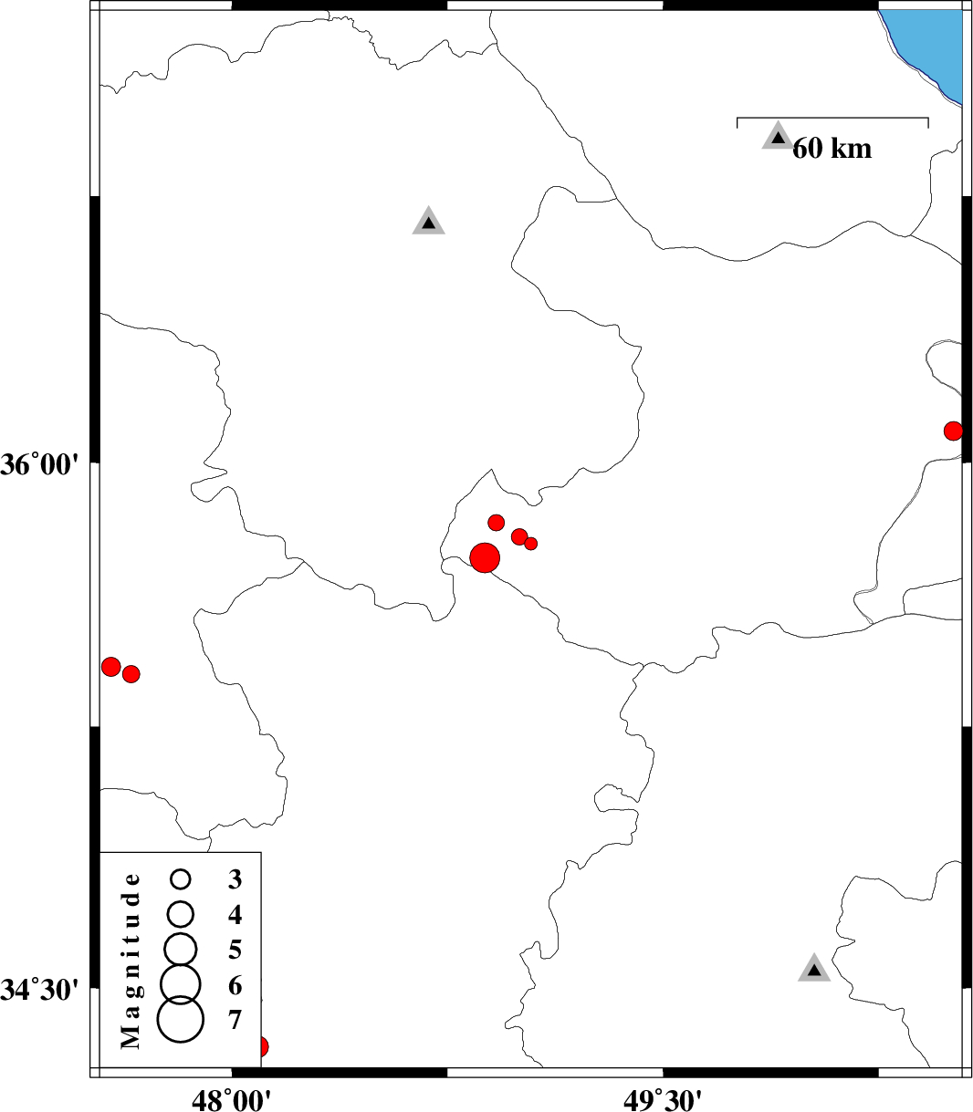 | 2004/11/08 | 20:03:19.4 | 23:33:19.4 | 35.73 | 48.88 | 15 | ML:4.6 | 41 km North-West of Razan, Hamedan Province |