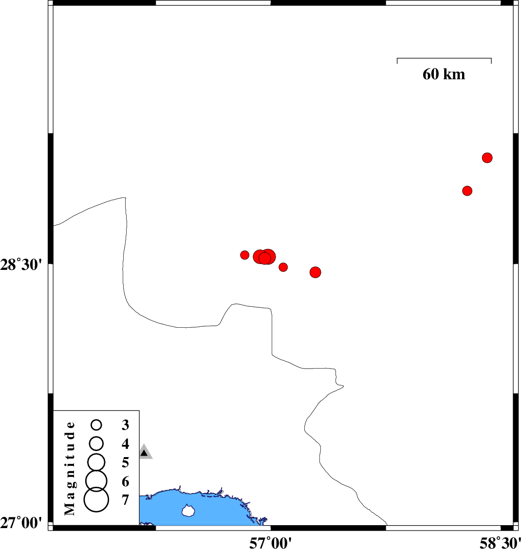 | 2004/11/12 | 01:06:57.2 | 04:36:57.2 | 28.45 | 57.29 | 38 | ML:3.2 | 50 km South-West of Jiroft, Kerman Province | ||