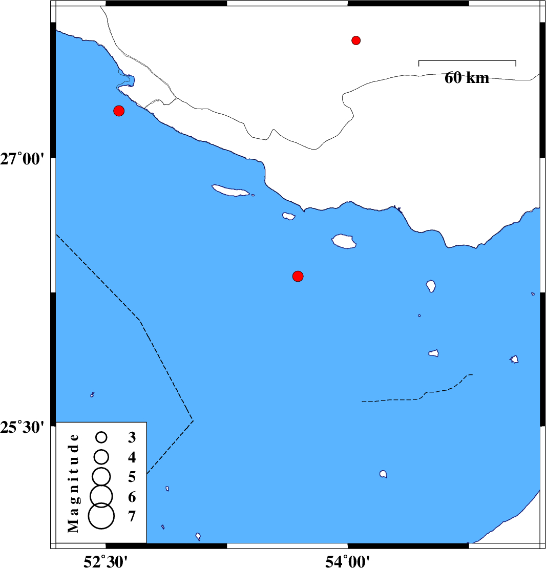 | 2004/11/11 | 17:25:24.4 | 20:55:24.4 | 27.26 | 52.58 | 14 | ML:3 | Persian Gulf, 43 km South-West of Mehr | ||