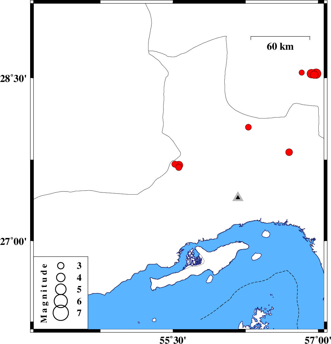2004/11/16 | 03:25:34.5 | 06:55:34.5 | 27.82 | 56.7 | 35 | ML:3.3 | 68 km North-West of Dehbarez, Hormozgan Province | ||