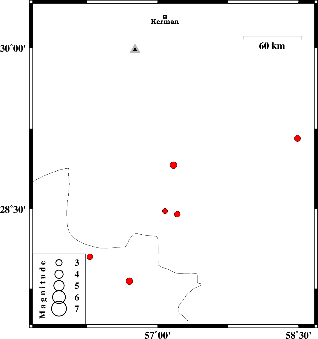 2004/11/18 | 15:31:47.6 | 19:01:47.6 | 29.16 | 58.49 | 14 | ML:2.9 | 14 km East of Bam, Kerman Province | ||
