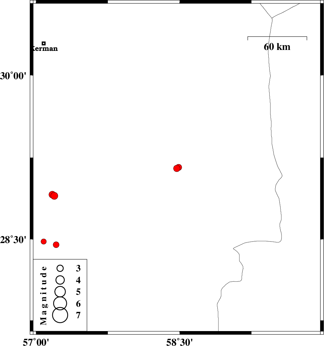 | 2004/11/15 | 07:53:45.0 | 11:23:45.0 | 28.48 | 57.08 | 15 | ML:2.6 | 67 km South-West of Jiroft, Kerman Province |