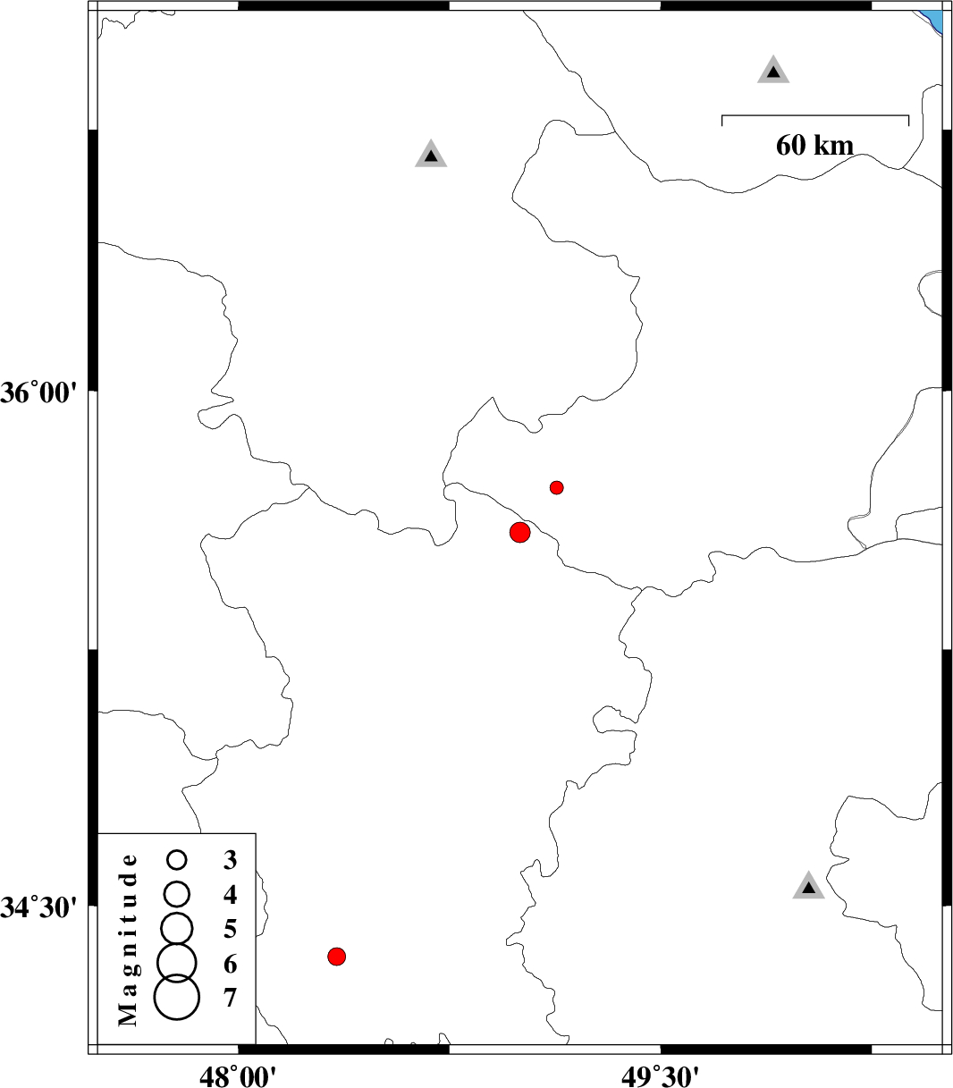 | 2004/11/28 | 03:25:02.0 | 06:55:02.0 | 35.72 | 49.13 | 16 | ML:2.1 | 38 km North of Razan, Hamedan Province | ||