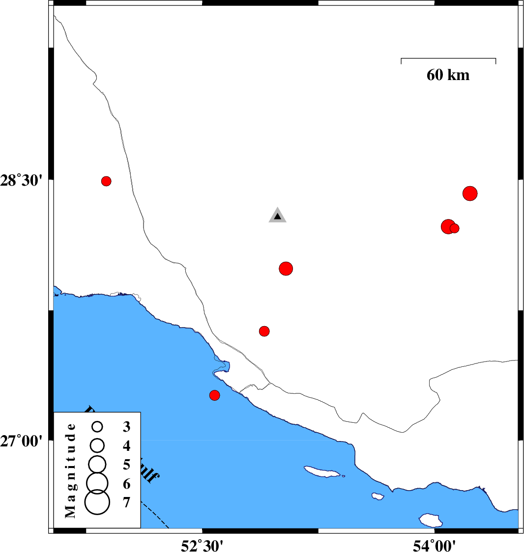 2004/11/11 | 17:25:24.4 | 20:55:24.4 | 27.26 | 52.58 | 14 | ML:3 | Persian Gulf, 43 km South-West of Mehr | ||