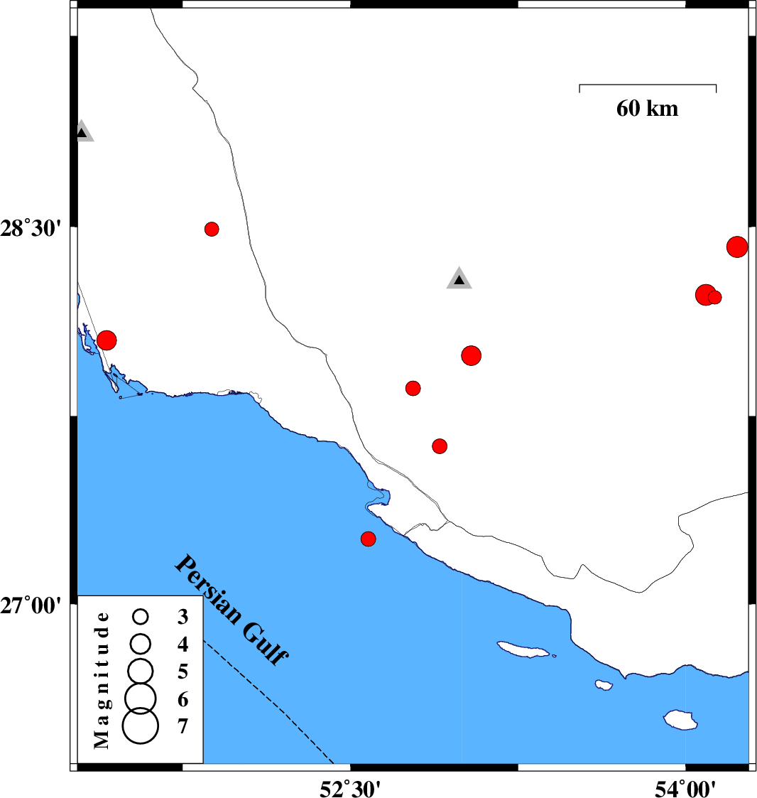 2004/11/11 | 17:25:24.4 | 20:55:24.4 | 27.26 | 52.58 | 14 | ML:3 | Persian Gulf, 43 km South-West of Mehr | ||