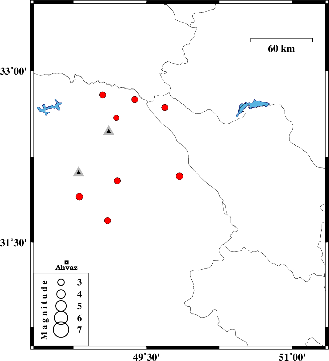 | 2004/12/01 | 20:49:27.1 | 00:19:27.1 | 32.04 | 49.2 | 17 | ML:2.9 | 15 km North-West of Masjed Soleyman, Khoozestan Province | ||