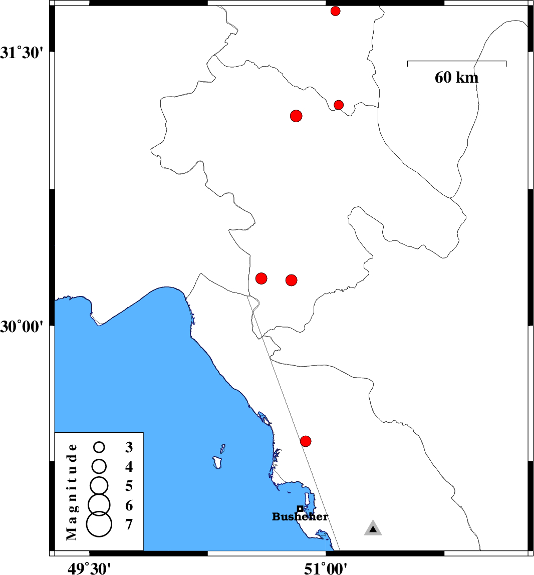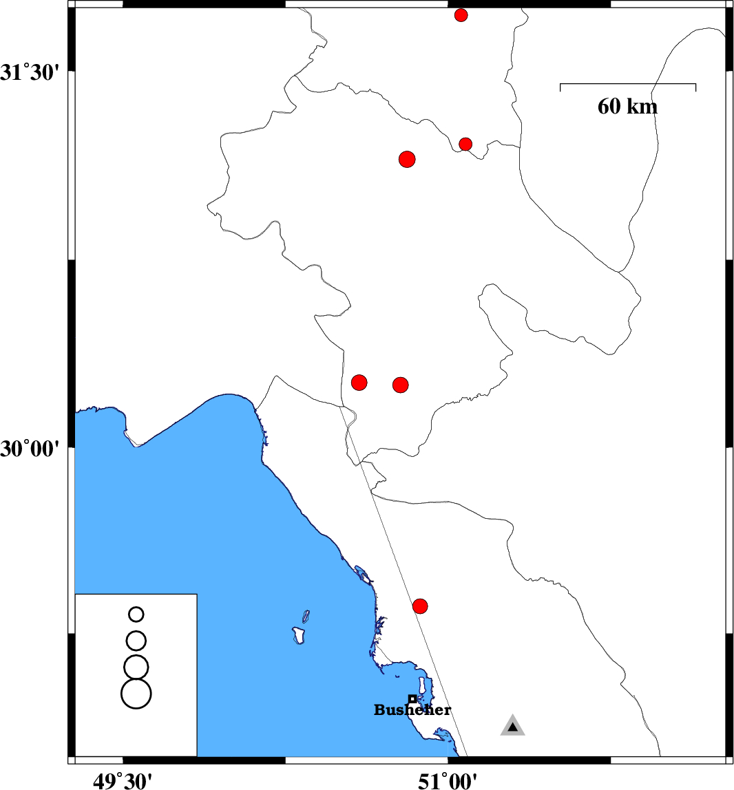 | 2004/12/05 | 00:30:30.4 | 04:00:30.4 | 29.36 | 50.87 | 14 | ML:3.1 | 34 km West of Borazjan, Bushehr Province |