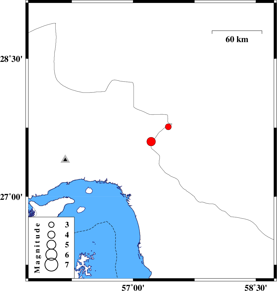 2004/12/08 | 10:04:02.8 | 13:34:02.8 | 27.6 | 57.22 | 18 | ML:4.8 | 19 km North of Dehbarez, Hormozgan Province |