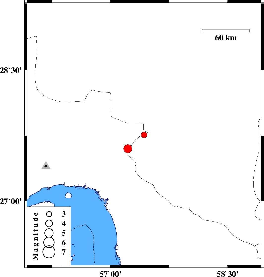 2004/12/08 | 10:15:46.0 | 13:45:46.0 | 27.76 | 57.43 | 14 | ML:3.4 | 33 km South-West of Kahnuj, Kerman Province | ||