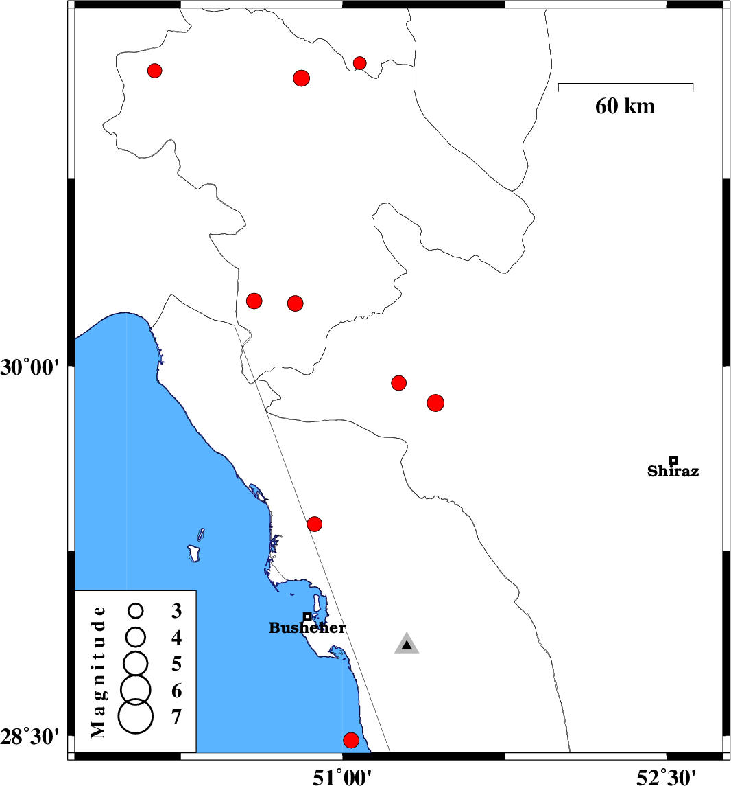 | 2004/12/05 | 00:30:30.4 | 04:00:30.4 | 29.36 | 50.87 | 14 | ML:3.1 | 34 km West of Borazjan, Bushehr Province | ||