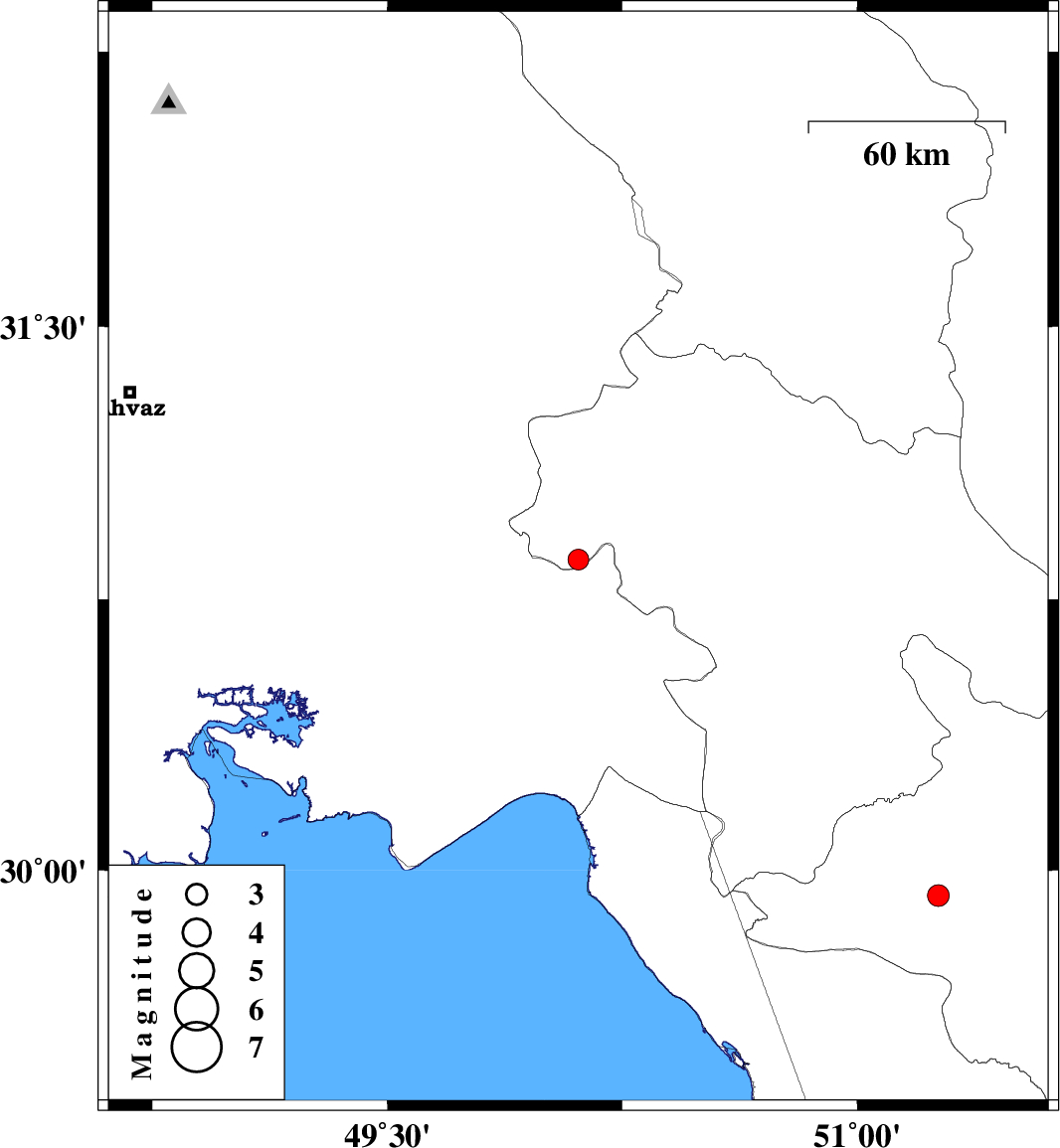 | 2004/12/14 | 18:08:38.4 | 21:38:38.4 | 30.86 | 50.11 | 15 | ML:3 | 32 km North-West of Behbahan, Khoozestan Province | ||